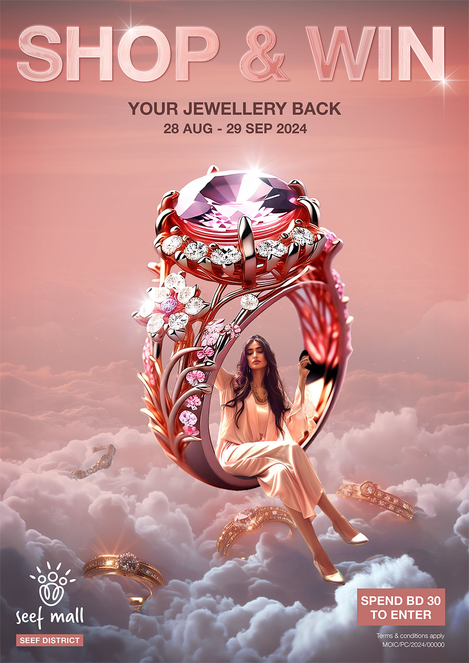 This year’s summer campaign for “Shop & Win” provides our shoppers the opportunity to win their jewelry value back upon spending a minimum of 30 BD in Seef Mall – Seef District fine jewelry stores, till 28th September 2024!